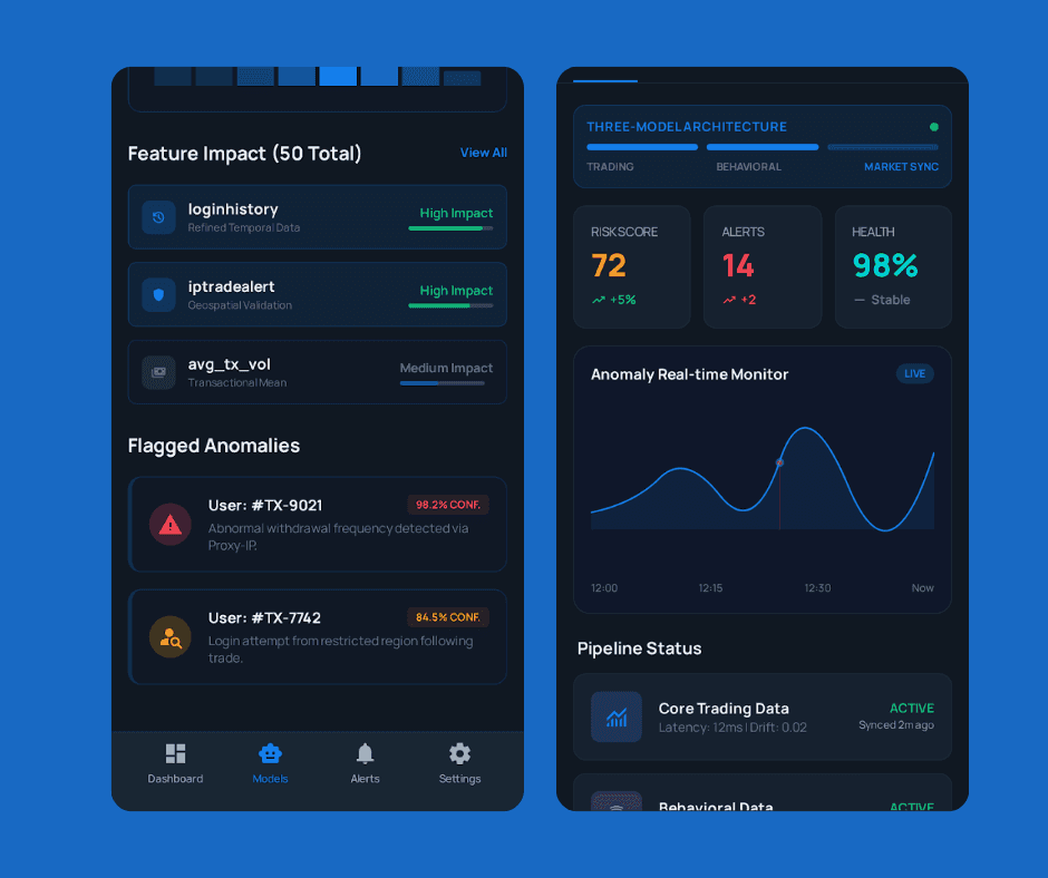 We developed an AI-driven financial risk intelligence platform that analyzes trading behaviour, leverage exposure, and market volatility to identify high-risk accounts in real time. Powered by a multi-model machine learning architecture and automated alert workflows, the system enables financial teams to monitor risk proactively, prevent margin breaches, and respond faster to suspicious activity. A secure Telegram intelligence bot delivers real-time alerts, market summaries, and on-demand user analysis, turning complex data into immediate operational decisions while improving compliance, reducing risk, and increasing visibility across trading ecosystems.